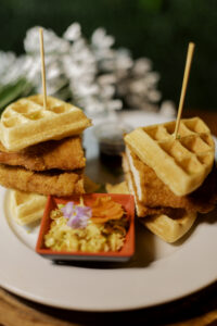 Homemade waffle topped with breaded chicken breast (7 oz), served with a side of coleslaw ...