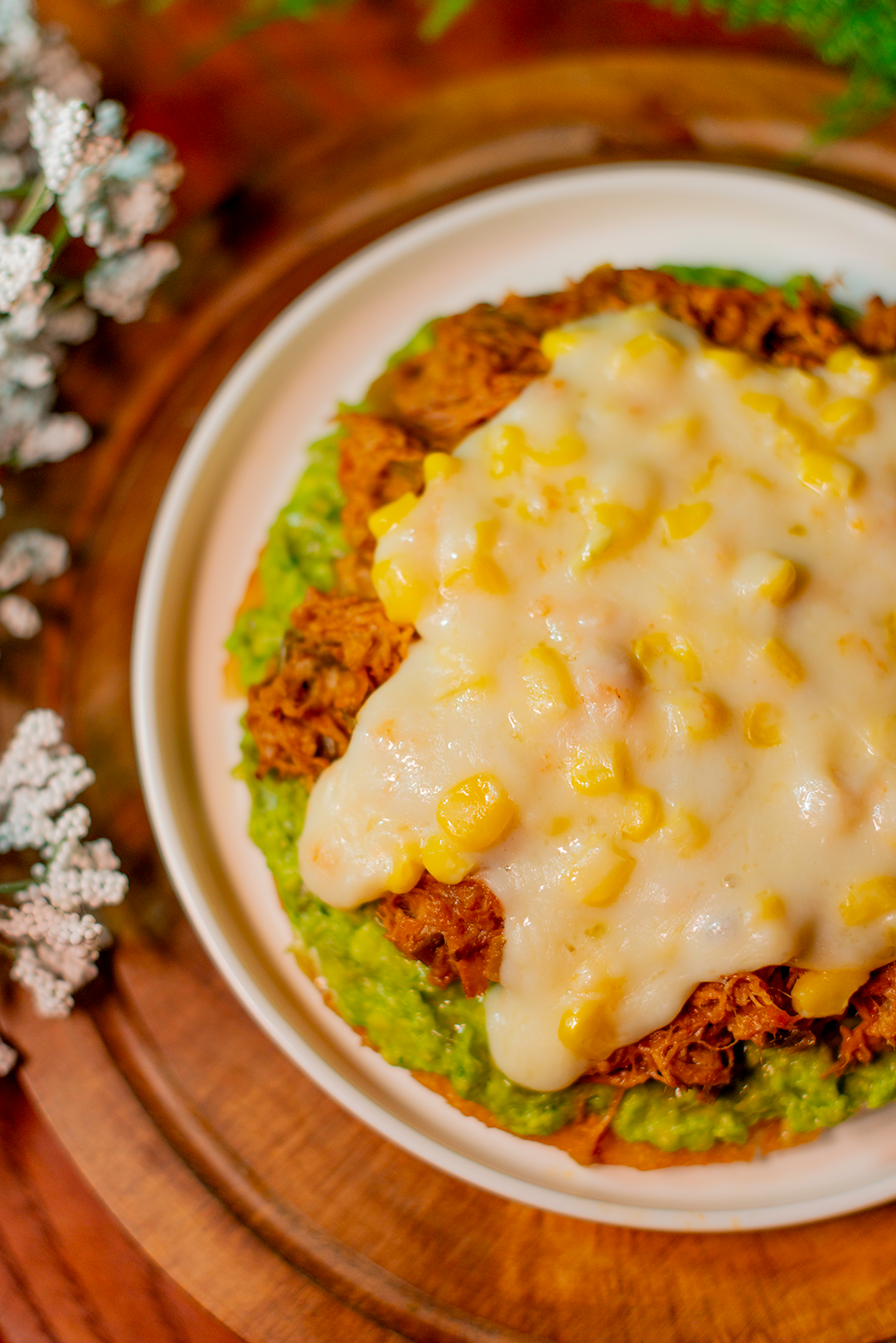 Arepa de carne desmechada, hogao, queso mozzarella derretido, maicitos, guacamole y salsa de la casa.