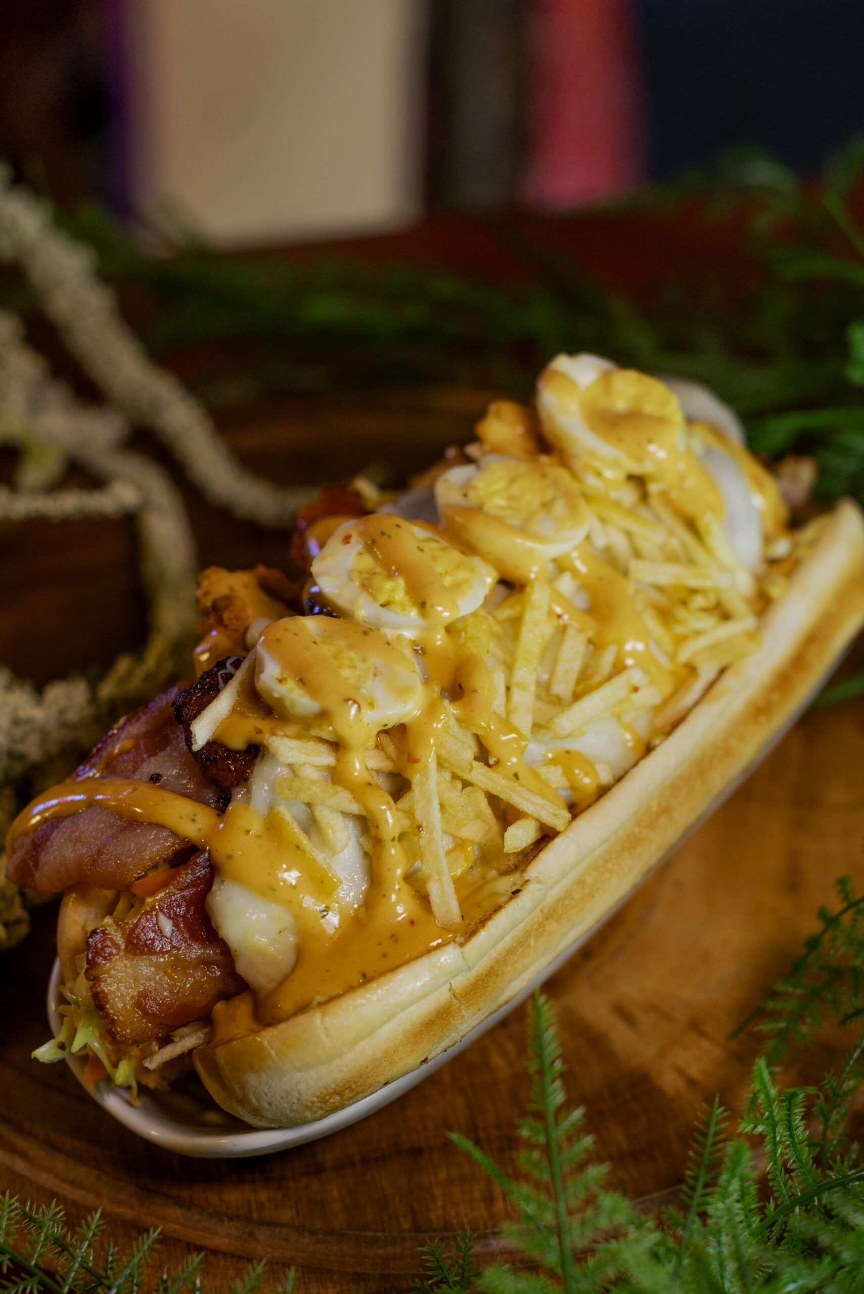 Ensalada dulce, coronado con doble queso derretido, dos tiras de Bacon crujiente,