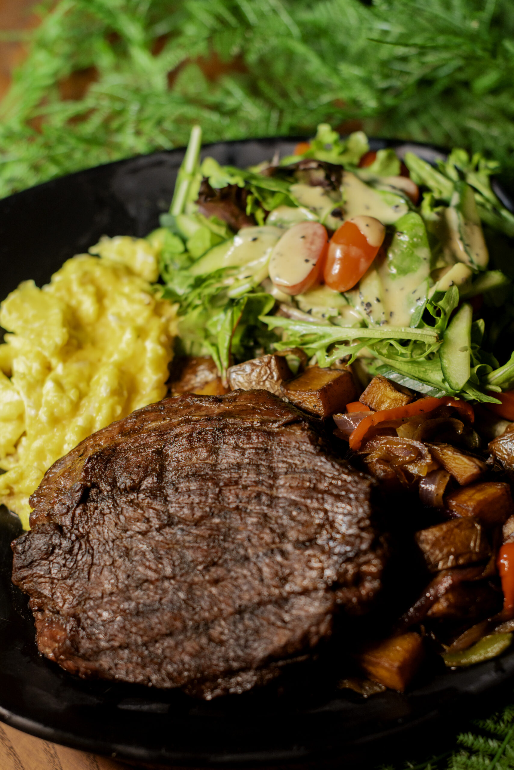 STEAK AND EGGS Prime 8 oz steak with eggs scrambled. Served with your choice of potato (French fries or home fries), house salad, and chimichurri. Category: BRUNCH